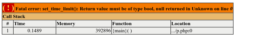 | Summary | 0001834: Return type must be bool in overloaded set_time_limit | ||||