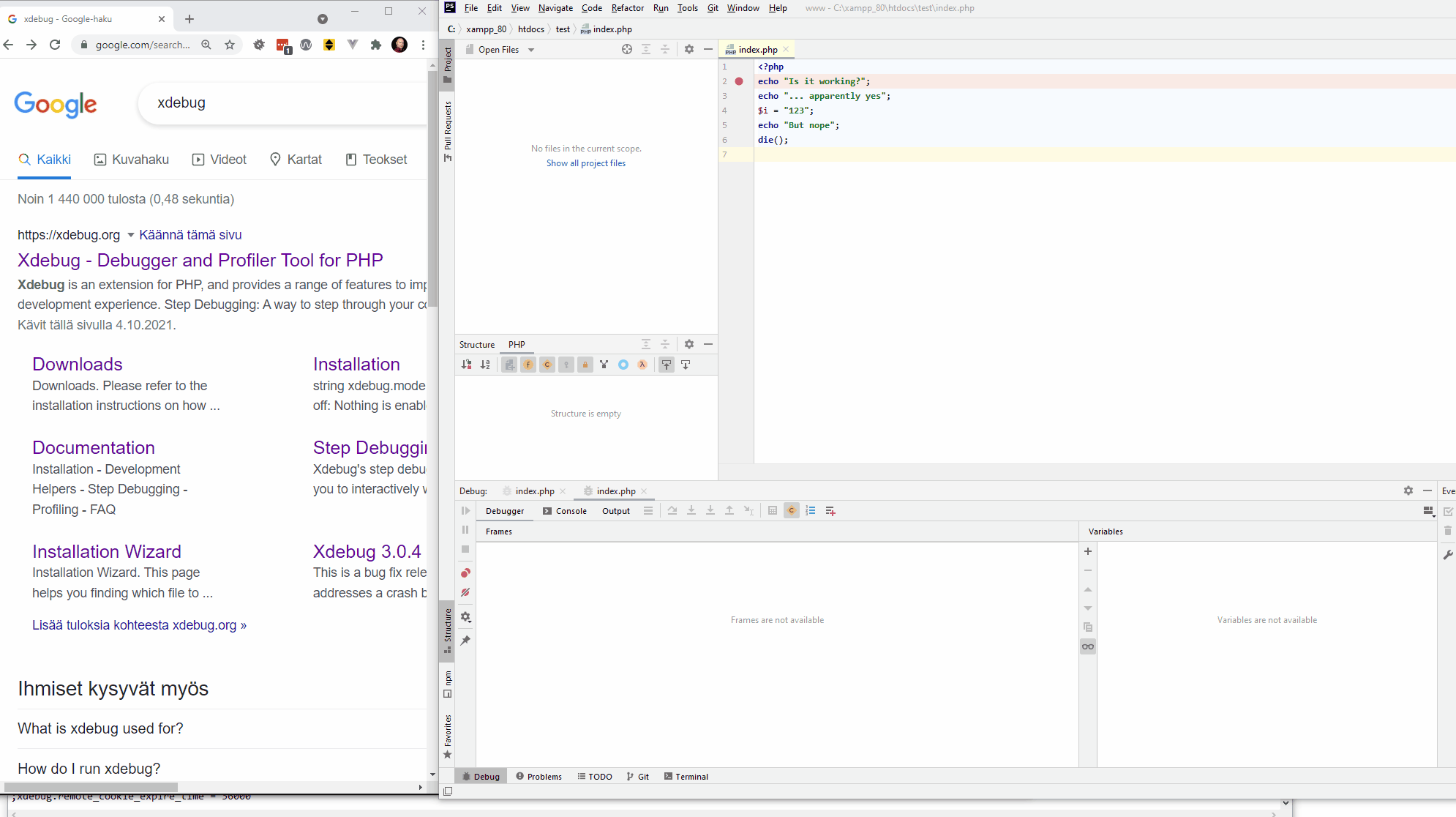 | Description | I faced a problem with Xdebug 3.1.0 TS version not working correctly on latest (or any) version of PhpStorm on XAMPP PHP 8.0.11 TS Windows installation. Whenever something else than just "echo" was hit step-debug seems to silently crash. Switching to 3.0.4 seems to work just fine with same settings. Details of this issue have been described to a detail at https://intellij-support.jetbrains.com/hc/en-us/community/posts/4407744683922--solved-Xdebug-3-PHP-8-0-11-xdebug-fails-at-variable-?page=1#community_comment_4407821522578 You can also see GIF screen capture of this issue at forum message. I also added this animation as an attachment to this ticket. | ||||