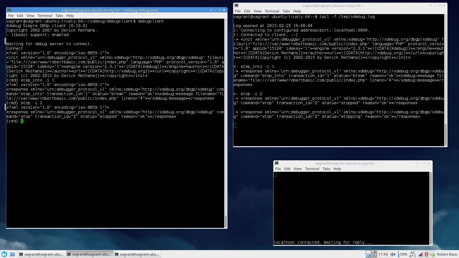 | Additional Information | Reproduced on both xdebug 2.3.1 and 2.2.7 on PHP 5.6.6 and PHP 5.5.9. Xdebug configuration is minimal with xdebug.remote_enable=1 Attached a screenshot of terminals with the steps (debugclient, www-browser, tail of the log file) | ||||