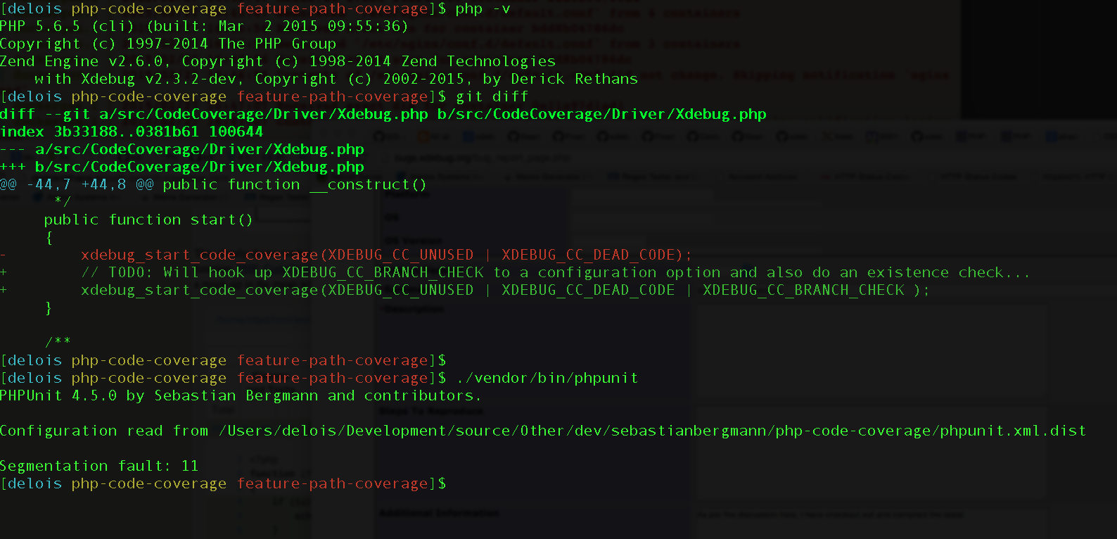GDB Backtrace: php-code-coverage root# gdb --args php ./vendor/bin/phpunit --debug Configuration read from /Users/delois/Development/source/Other/dev/sebastianbergmann/php-code-coverage/phpunit.xml.dist Starting test 'PHP_CodeCoverage_FilterTest::testAddingAFileToTheBlacklistWorks'. Program received signal SIGSEGV, Segmentation fault. |