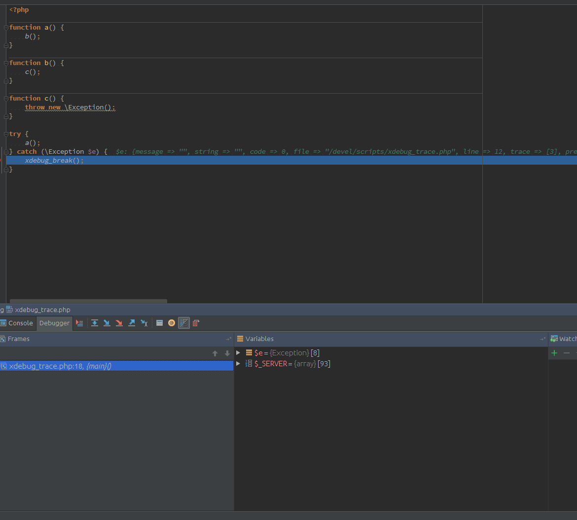 | Description | Try to debug this code: <?php function a() { function b() { function c() { try { Open this code in IDE, i.e. PhpStorm put breakpoint to