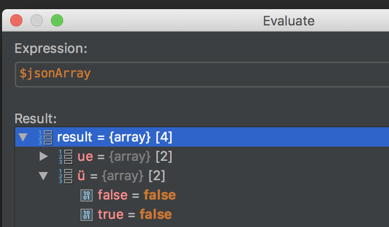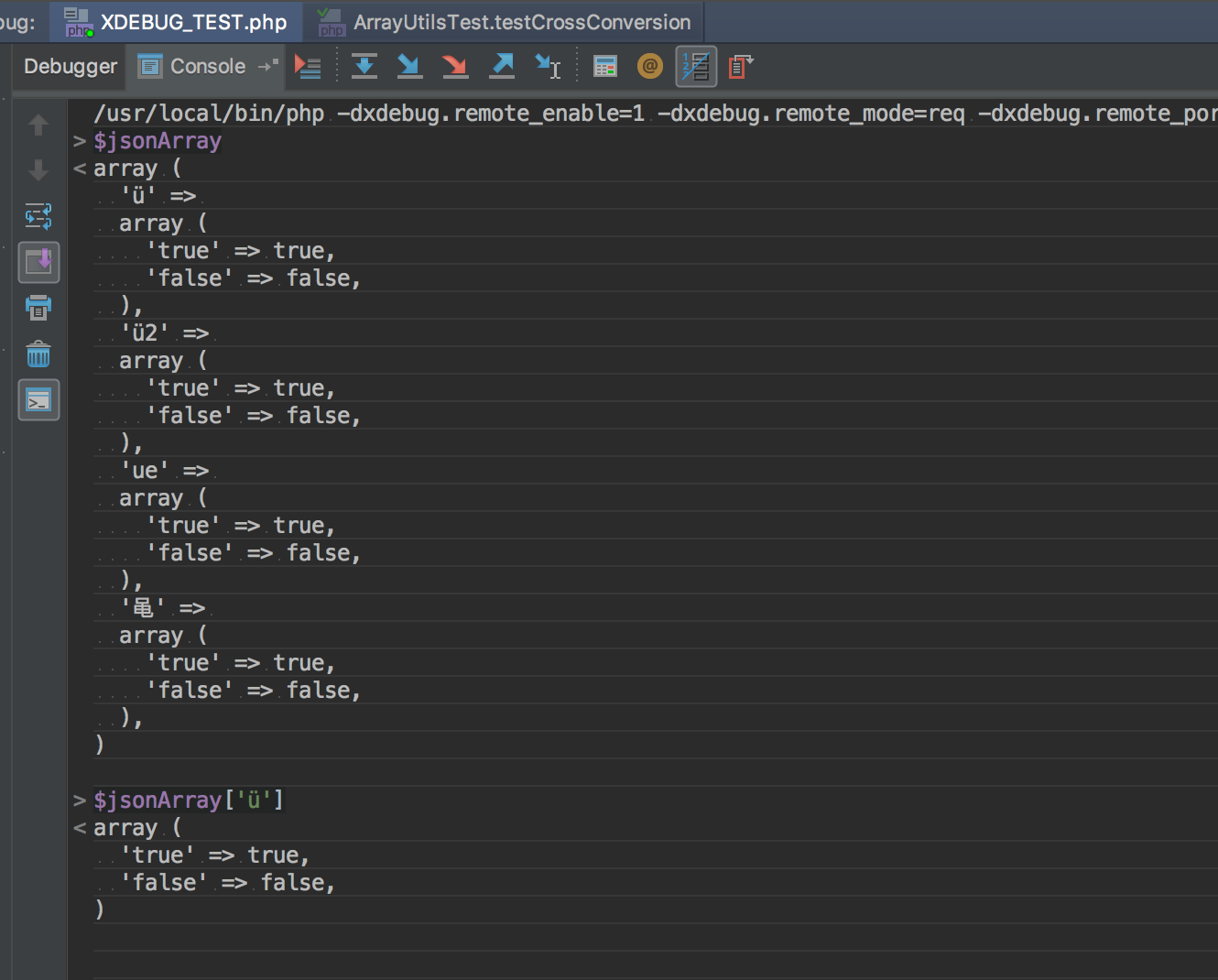 Hi, I can reproduce this with PhpStorm, but I also believe that's where the problem lies. The output in Xdebug for: property_get -i 44 -n "$jsonArray[\"ü2\"]" -d 0 -c 0 -p 0 returns (correctly): <response xmlns="urn:debugger_protocol_v1" xmlns:xdebug="http://xdebug.org/dbgp/xdebug" command="property_get" transaction_id="44"><property type="array" children="1" numchildren="2" page="0" pagesize="100"><name encoding="base64"><![CDATA[JGpzb25BcnJheVsiw7wyIl0=]]></name><fullname encoding="base64"><![CDATA[JGpzb25BcnJheVsiw7wyIl0=]]></fullname><property name="true" type="bool"><fullname encoding="base64"><![CDATA[JGpzb25BcnJheVsiw7wyIl1bInRydWUiXQ==]]></fullname><value encoding="base64"><![CDATA[MQ==]]></value></property><property name="false" type="bool"><fullname encoding="base64"><![CDATA[JGpzb25BcnJheVsiw7wyIl1bImZhbHNlIl0=]]></fullname><value encoding="base64"><![CDATA[MA==]]></value></property></property></response> The values (<![CDATA[MQ==]]>) and (<![CDATA[MA==]]>) are "1" and "0" respectively, but PhpStorm shows them both as false in the UI. I filed the following ticket with them: https://youtrack.jetbrains.com/issue/WI-40762 And I'm closing this issue, as this is not a bug in Xdebug. Thanks for the detailed report! cheers, |