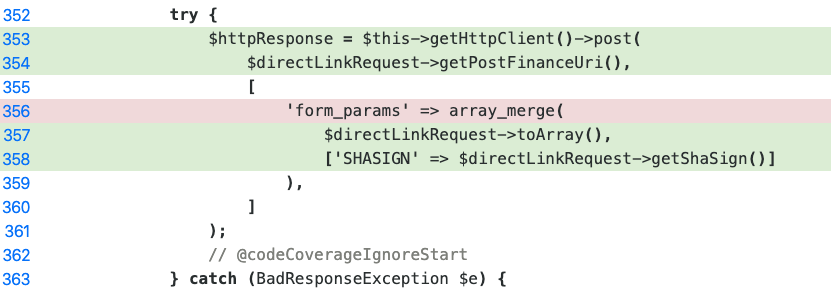 I am having the same issue. I have found this to be the case with multiple php functions such as json_encode, array_merge, array_map, sprintf, ... Working: Not working: in this not working example the line 'bar' => json_encode( is marked as not covered. |