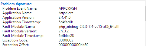 | Summary | 0001767: xdebug-2.9.3-7.4-vc15-x86_64.dll causes Xampp Apache Server crash - recommended by Debug Wizard | ||||