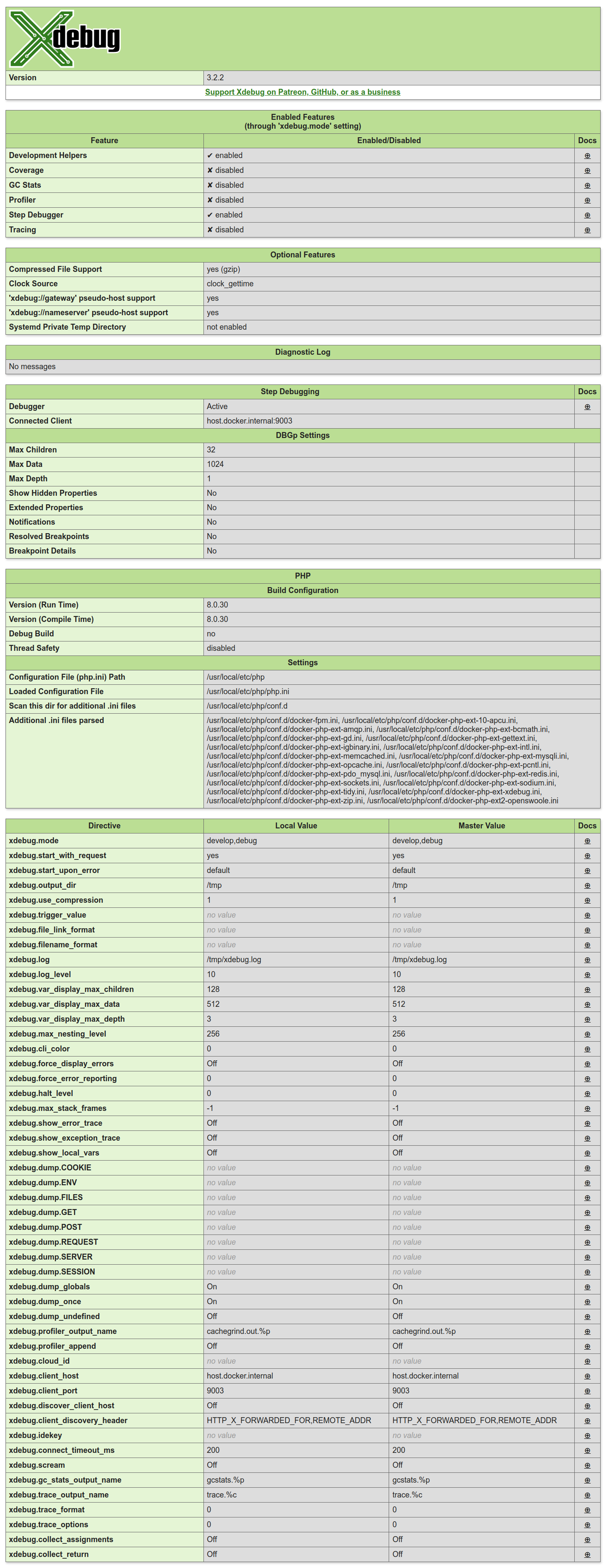 | Description | Hello, I cannot make step debugging working in a remote Docker container. I tried with Xdebug 3.0, 3.1, 3.2 and 3.3 with no success. | ||||
