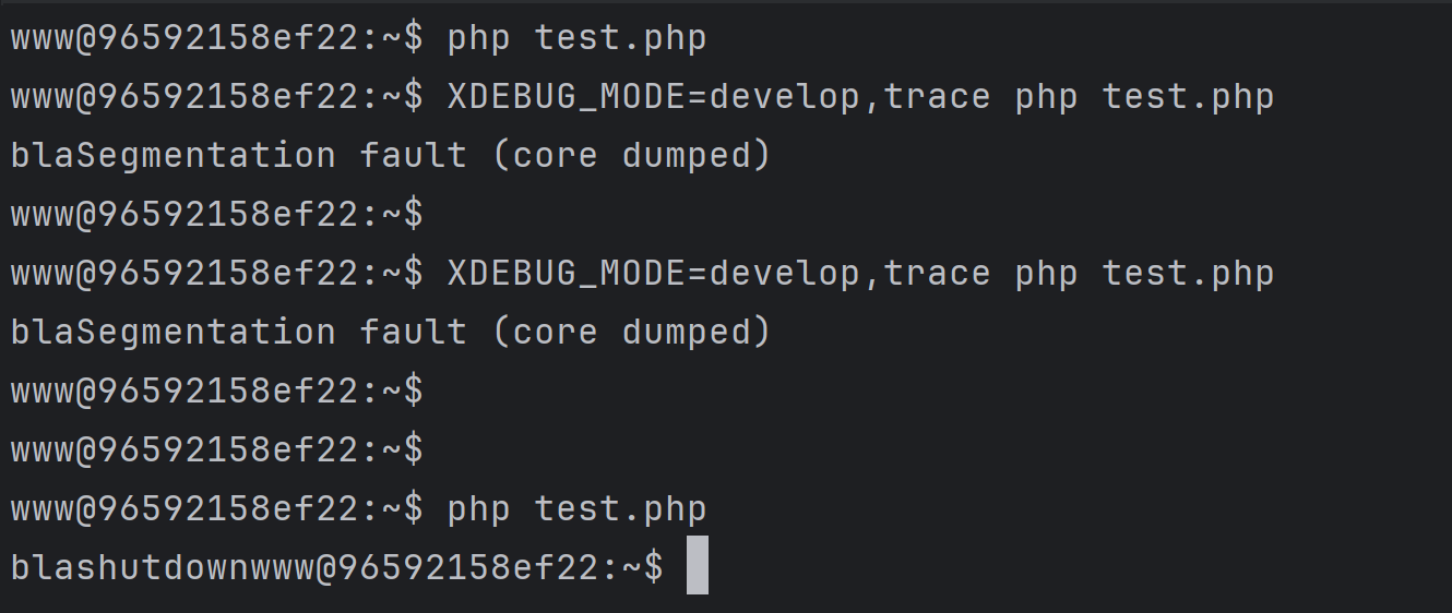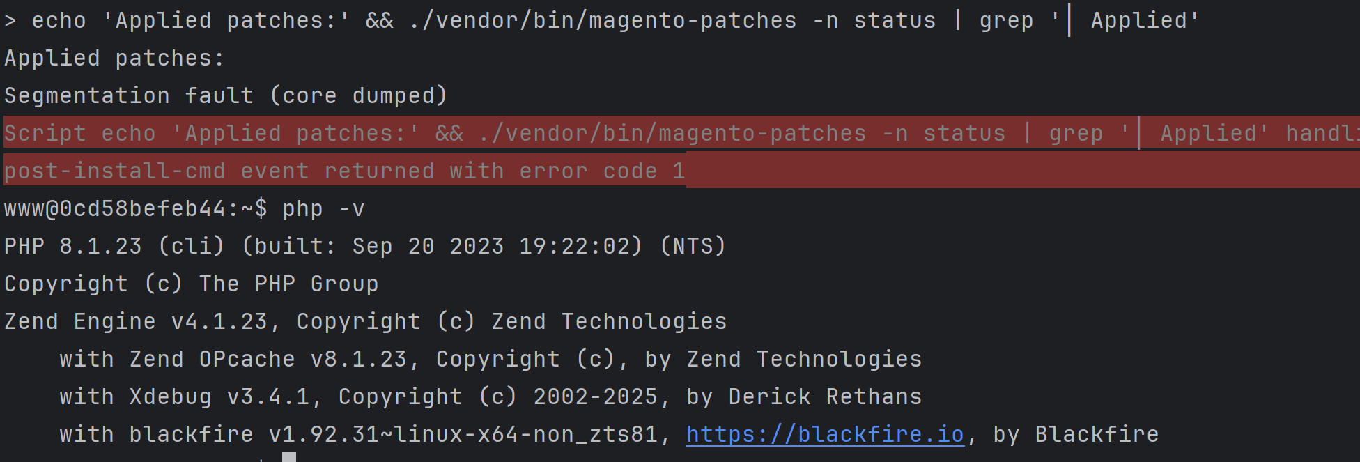 I did some extended testing with my reproducer and xdebug 3.4.1 The issue still present Works OK: Works NOT OK: I use this env Current setup: PHP 8.1.23 (cli) (built: Sep 20 2023 19:22:02) (NTS) I wondered if XDEBUG_MODE=develop might conflict with other profilers like blackfire and spx due to function overloading or neighbors decorators overlapping. But it previously worked just fine to me. I also followed some steps with GDB and got this result: Starting program: /usr/local/bin/php ./vendor/bin/magento-patches -n status Program received signal SIGSEGV, Segmentation fault. full output in gdb.txt gdb.txt (13,468 bytes)