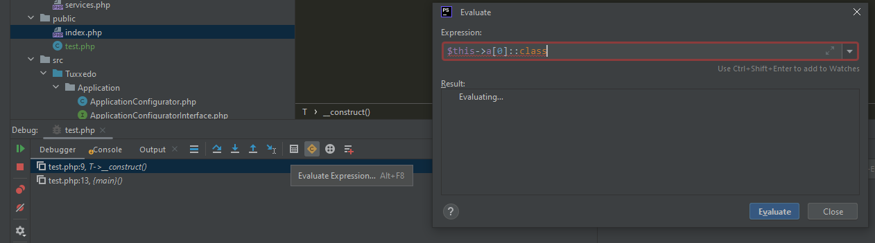 | Description | When using ::class to dereference the result of an expression during step-debugging, then xdebug will crash. This seems to only happen when you put a breakpoint and use the editor to manually evaluate an expression. In my case I use PHPStorm.