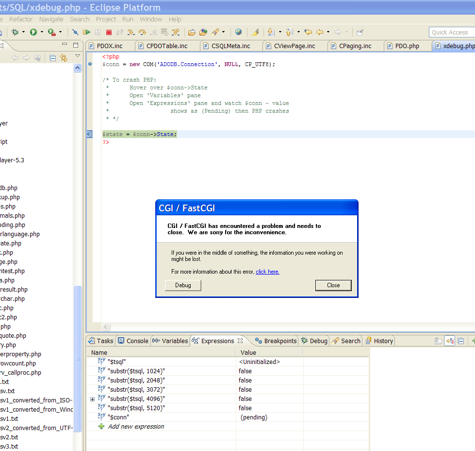 | Description | In Eclipse PDT, PHP crashes when a COM object is in scope. Crash does not occur when Variables/Expressions is hidden, but still occurs when hovering over the COM object. Whenever Eclipse tries to evaluate the object or expression in the debugger, PHP crashes. | ||||
